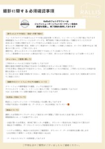 スタート時間が遅れた場合は、撮影時間が短くなる可能性がございますので、出来るだけ余裕をもってご出発いただきますようお願い致します。